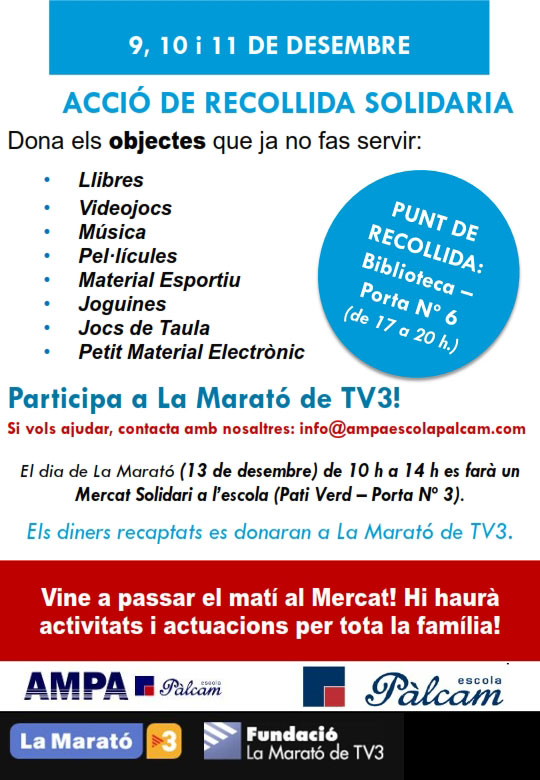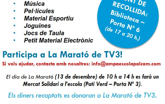 El dia de La Marató (13 de desembre) de 10 h a 14 h es farà un Mercat Solidari a l’Escola (Pati Verd – Porta Nº 3) i els diners recaptats es donaran a La Marató de TV3.